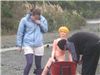 sam and andrea help lesa get comfortable, next to wheelbarrow