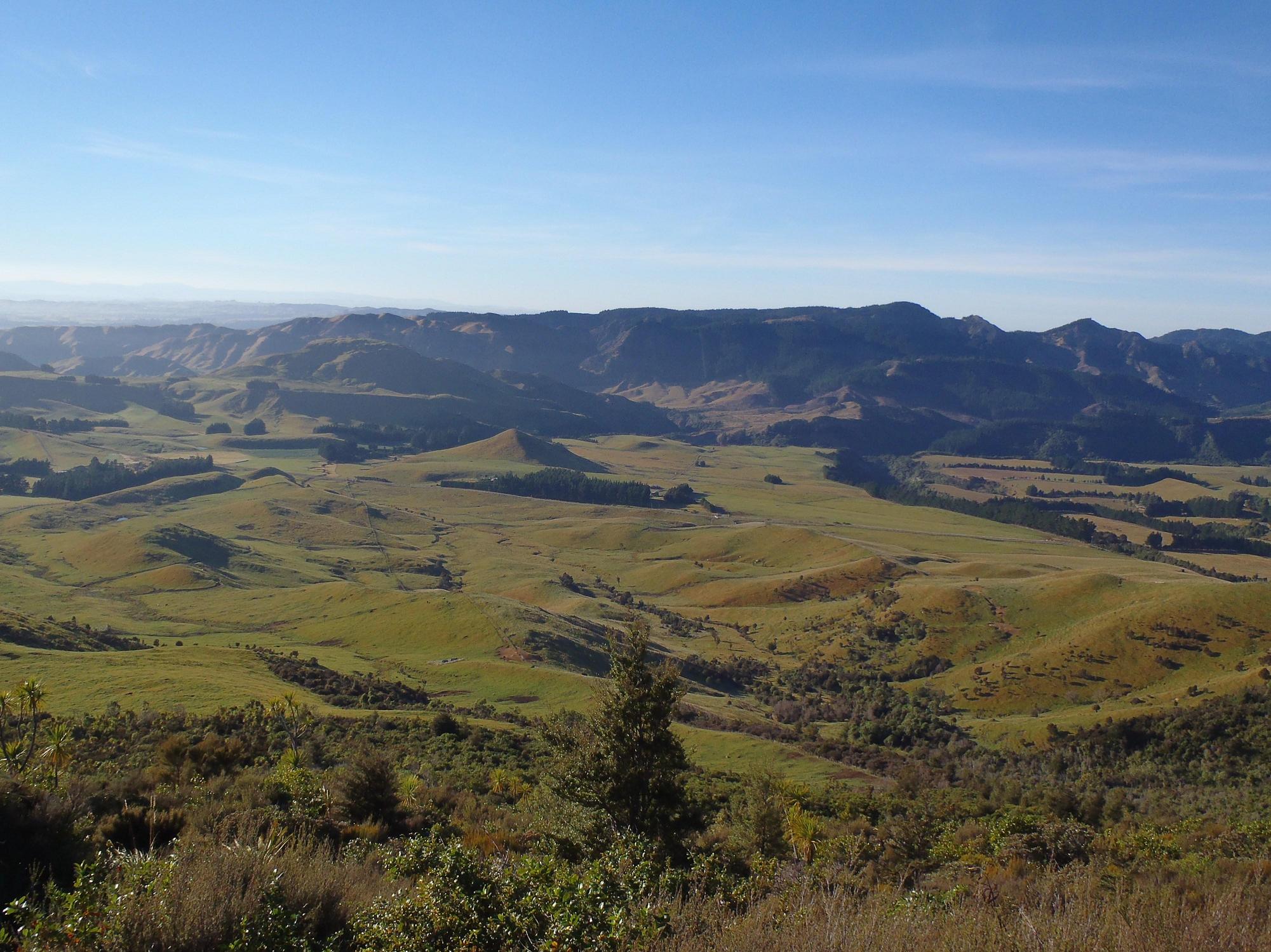 Climbing up from Master's shelter looking out over Hawke's Bay farmland.