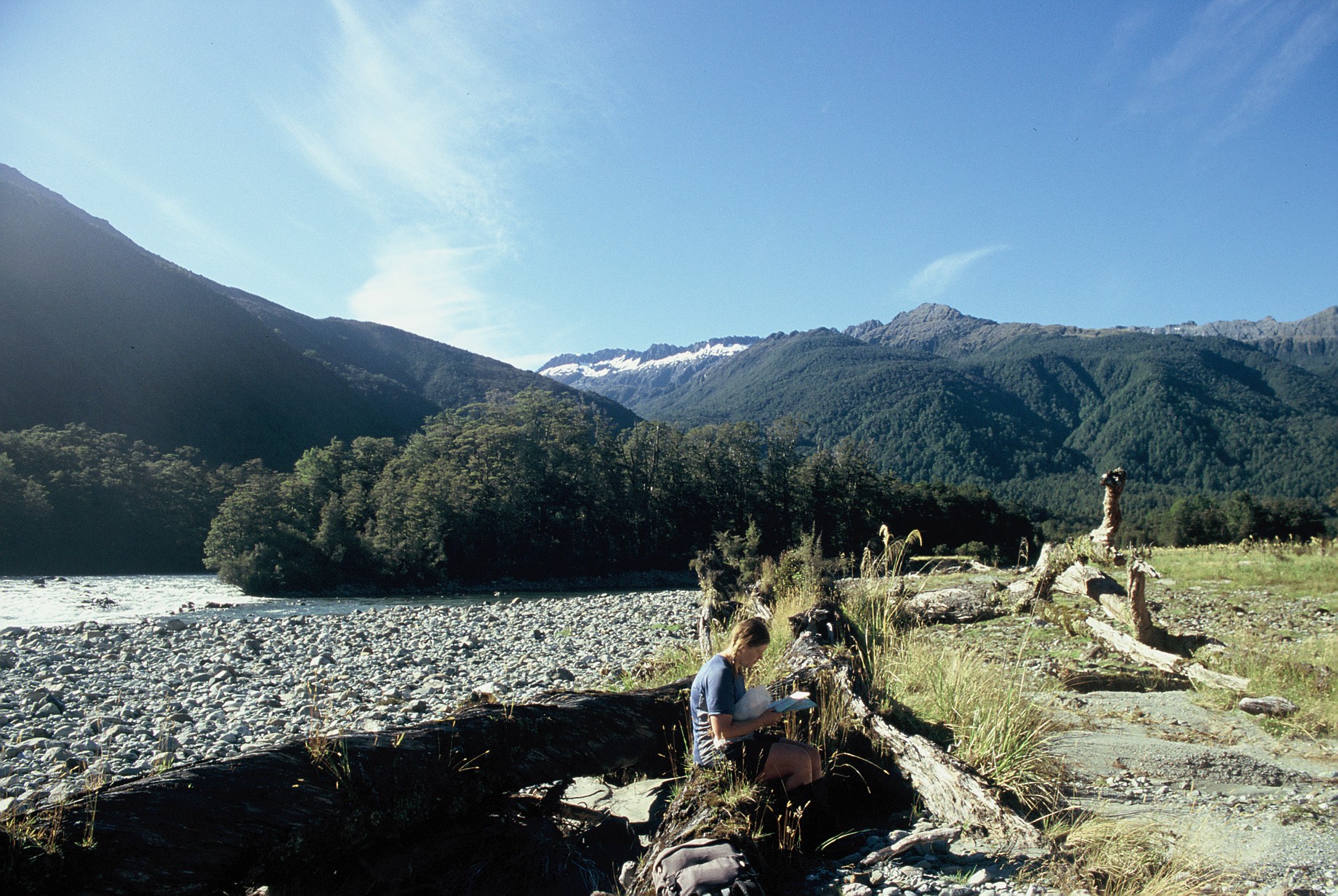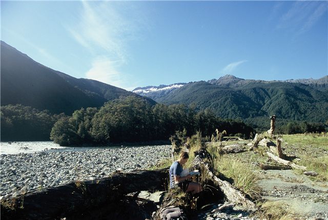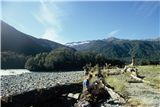 The Cascade is the largest unbridged river in New Zealand. It seperates the Olivine range from the Red Hills range. Note ultramafic rock on Olivine range on skyline.