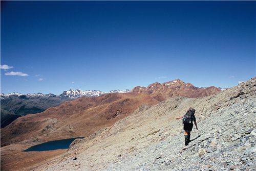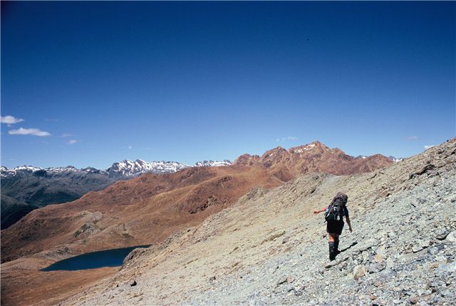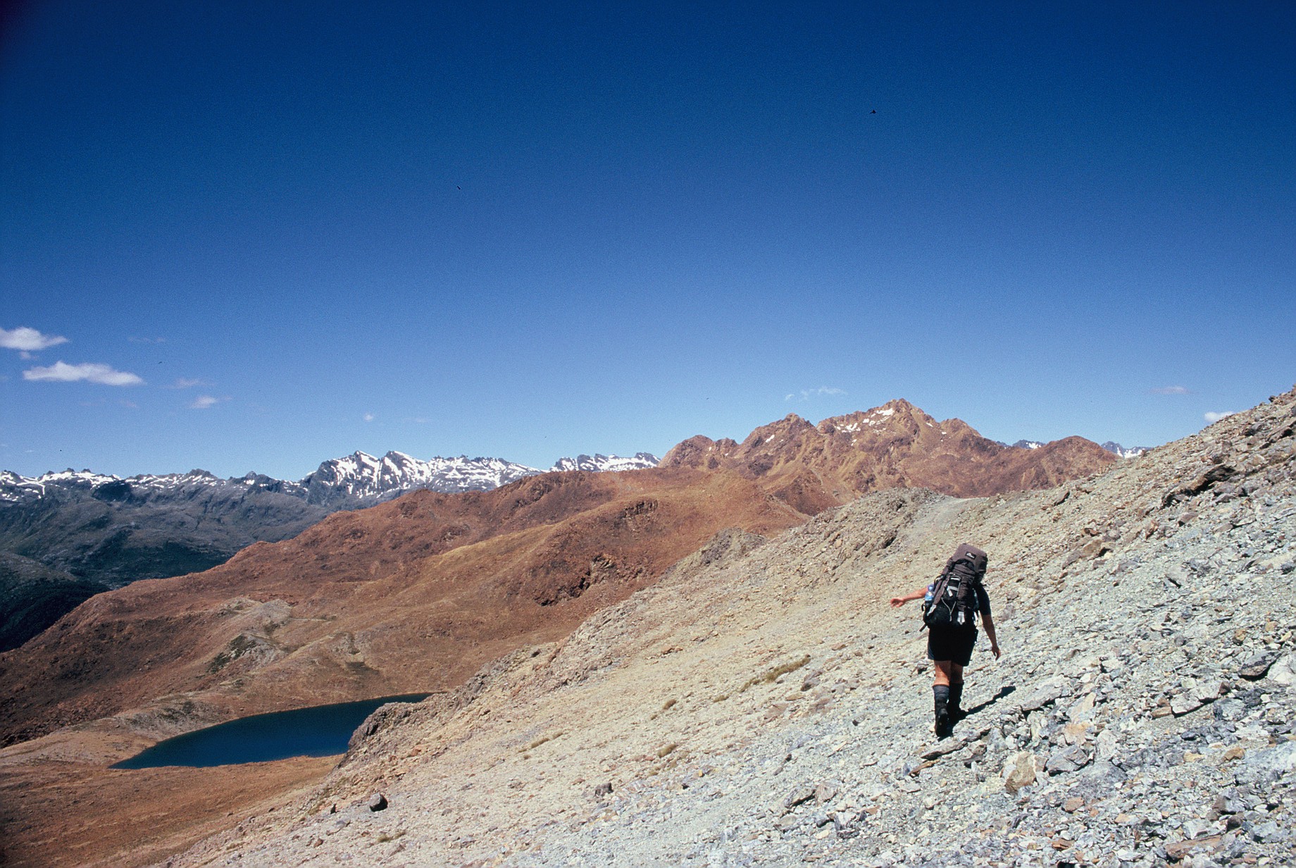 Red Mountain is above the trampers left shoulder. The peaks above the Olivine Ice Plateau are beyond