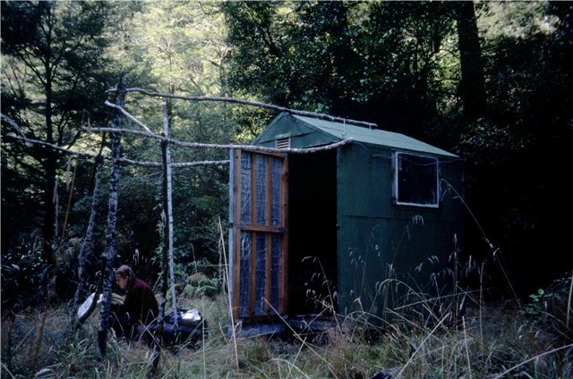This stand up biv sits deep in the canyon of the Waikotore stream. It gets very little sun and is known as "the fridge." The last report I heard was that it had a bad leak. The stream itself is incredible, deeply incised with massive papa bluffs. A very spectacular place.