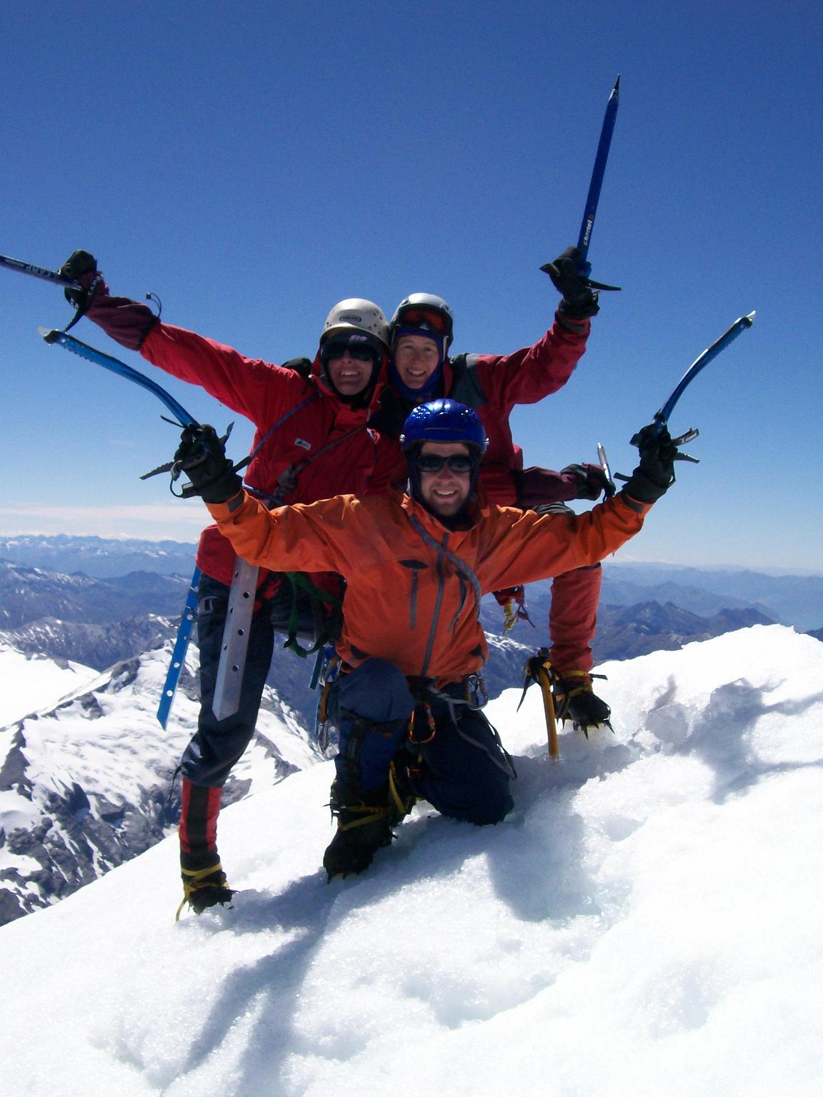 Me, Terra and Sophie on the top of Mt Aspiring. Guy as photographer and Alyn managing base camp at Bevan Col (unfortunately got food poisoning on summit day).