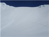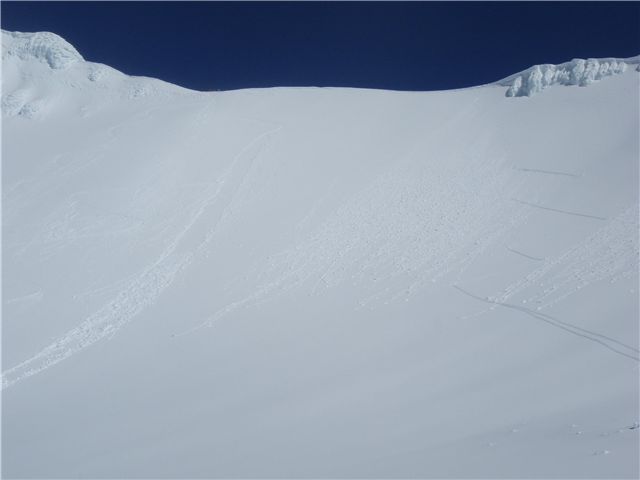 This is looking up at the saddle between Tahurangi and Te Ataahua from the Crater Lake. All the debris and tracks on the right side are from me and Ben skinning and then climbing up the steep soft snow to the saddle. The small avalanche centre left was triggered by me skiing down - you can see my tracks come out about halfway down on the right... The nice short turns on the far right are from Ben, who is a far better skier than me!