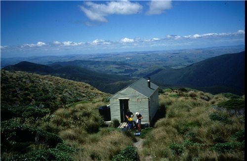 Photos of huts, bivs, and shelters in the Tararuas.