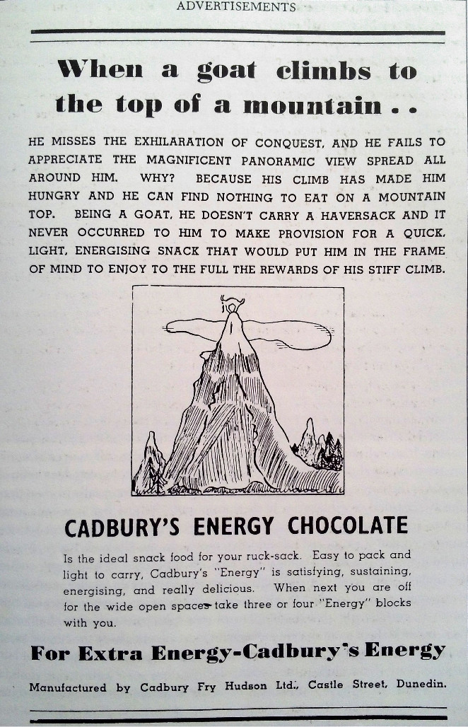 Yesterday I borrowed the book ''Tararua:The Story of a Mountain Range by Chris MacLean'' from the Wellington City Library - and this is what I read on page 223: ''This advertisement appeared regularly in Tararua Club magazines in the