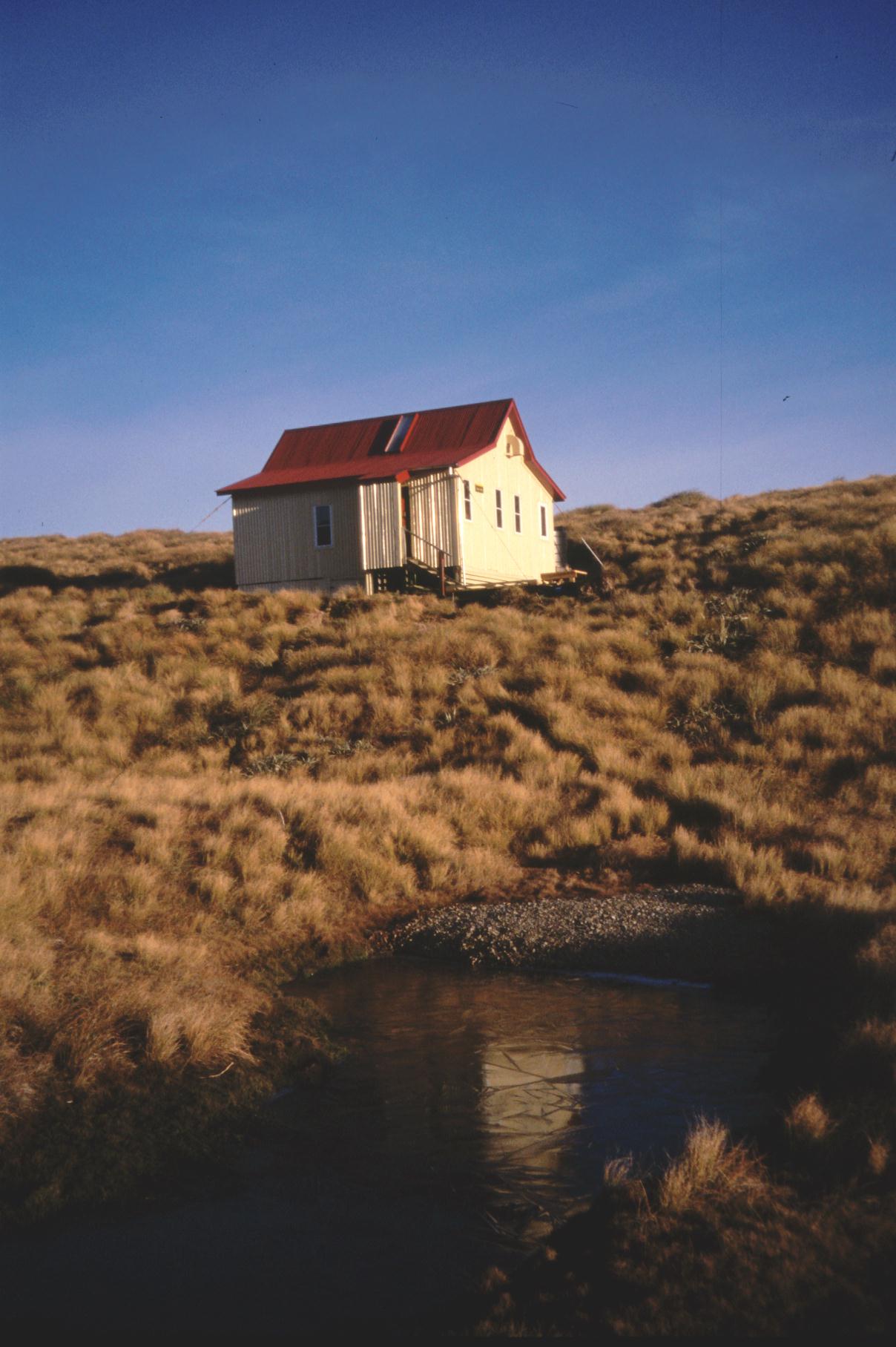 A famous (and cold!) Tararua hut, located on the Southern Crossing. Spectacular on a good day, but expect cold and clag. The hut is now cream and red.