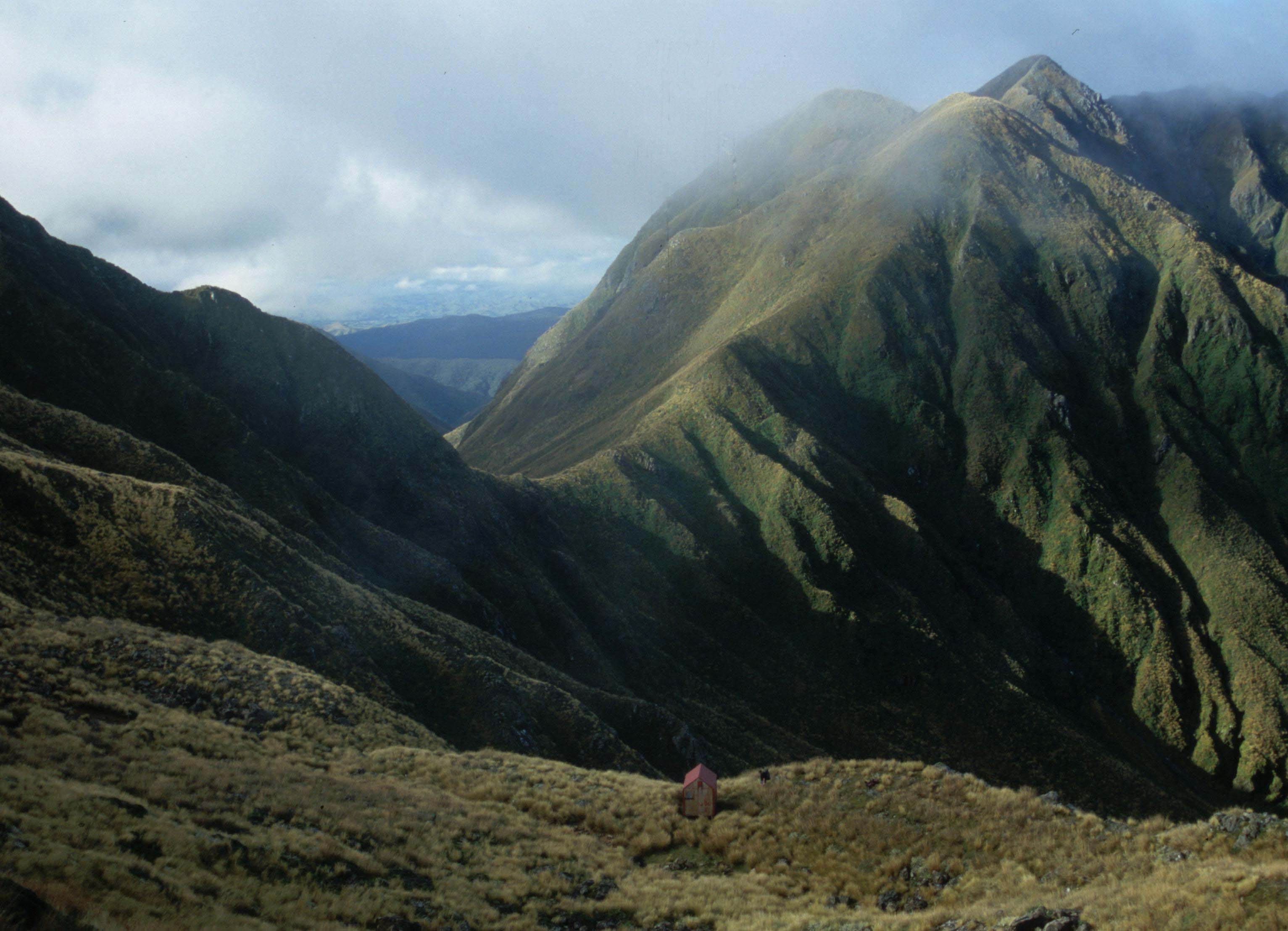 Arete Biv and the Twins from the route off the top of Arete. The Twins (along with Waingawa) bookend Bannister Ridge, one of the more challenging in the Tararuas. The saddle you can see drains into the Ruamahanga and the Waingawa.
